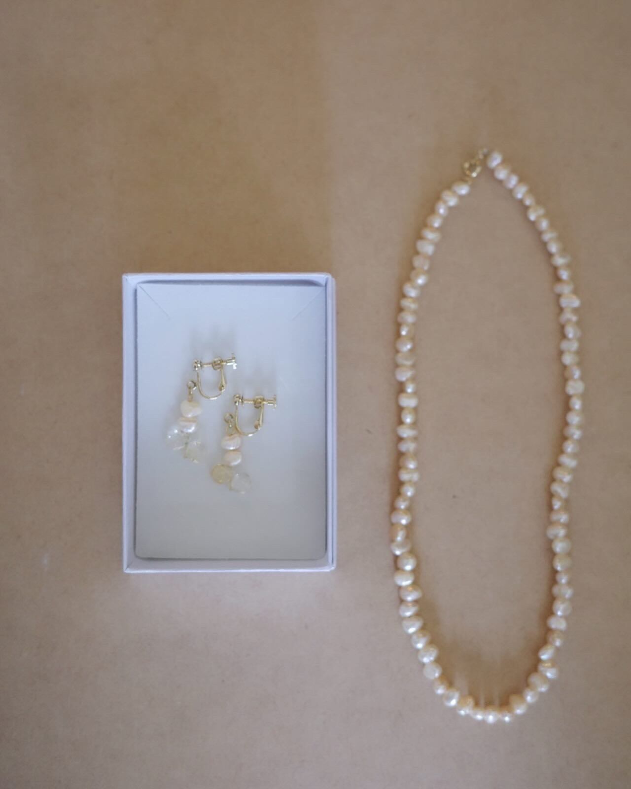 イヤリングには淡いイエローの透明感のあるシトリンの石とパールで、かわいく仕上げています。